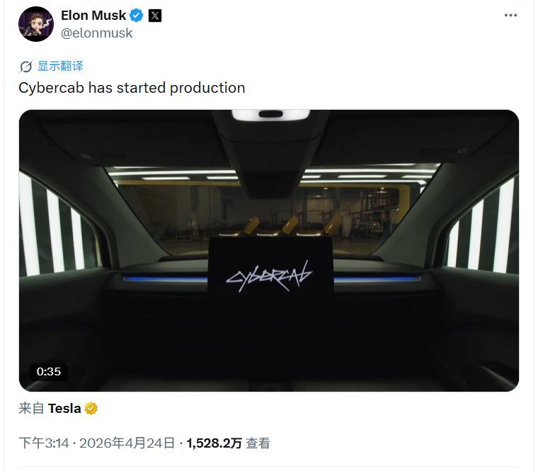 “你们所期待的Cybercab已经开始生产,”埃隆·马斯克在X平台(前身为推特)一篇帖子中表示,并分享了一段相关视频。